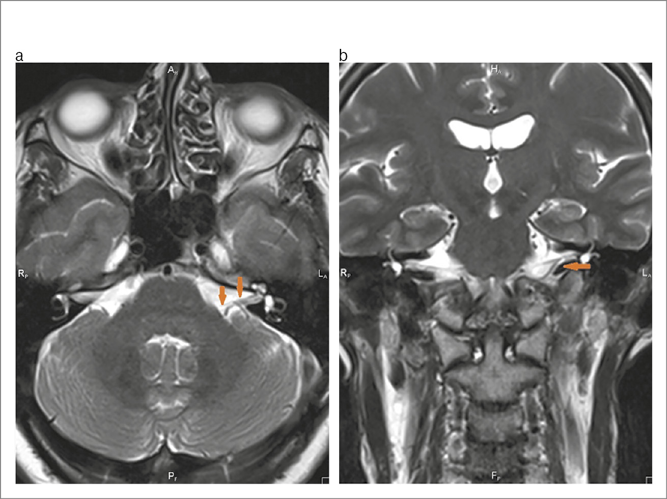 Лабораторно-инструментальные методы исследования: в клиническом и биохимическом анализах крови, общем анализе мочи отклонений от нормы не отмечено. По данным компьютерной томографии (КТ) височных костей патологических изменений в височных костях не выявлено (рис. 1). По данным КТ органов грудной клетки без патологических изменений очагового и/или инфильтративного характера в легких, верифицирован локальный участок пневмофиброза в верхней доле левого легкого; КТ-0. По результатам магнитно-резонансной томографии (МРТ) головного мозга обнаружены магнитно-резонансные признаки множественных очагов в белом веществе головного мозга (вероятнее всего, сосудистого характера), умеренного расширения субарахноидального пространства, низкое расположение миндалин мозжечка. Изменений в области мосто-мозжечкового угла не обнаружено (рис. 2, а, b). На магнитно-резонансной томографии черепных нервов с двух сторон визуализируется нормальный ход лицевых нервов (рис. 3). По данным ЭНМГ, выполненной на 5-е сутки от начала заболевания, определены признаки умеренно-выраженного поражения лицевого нерва слева. Характер поражения смешанный (поражение миелиновых оболочек и осевых цилиндров). Произвольная активация m. orbicularis oculi, m. orbicularis oris слева значительно снижена (рис. 4, а). Пациентка осмотрена оториноларингологом – данных за острую лор-патологию не выявлено, офтальмологом – OU «гипертоническая ангиопатия сетчатки».