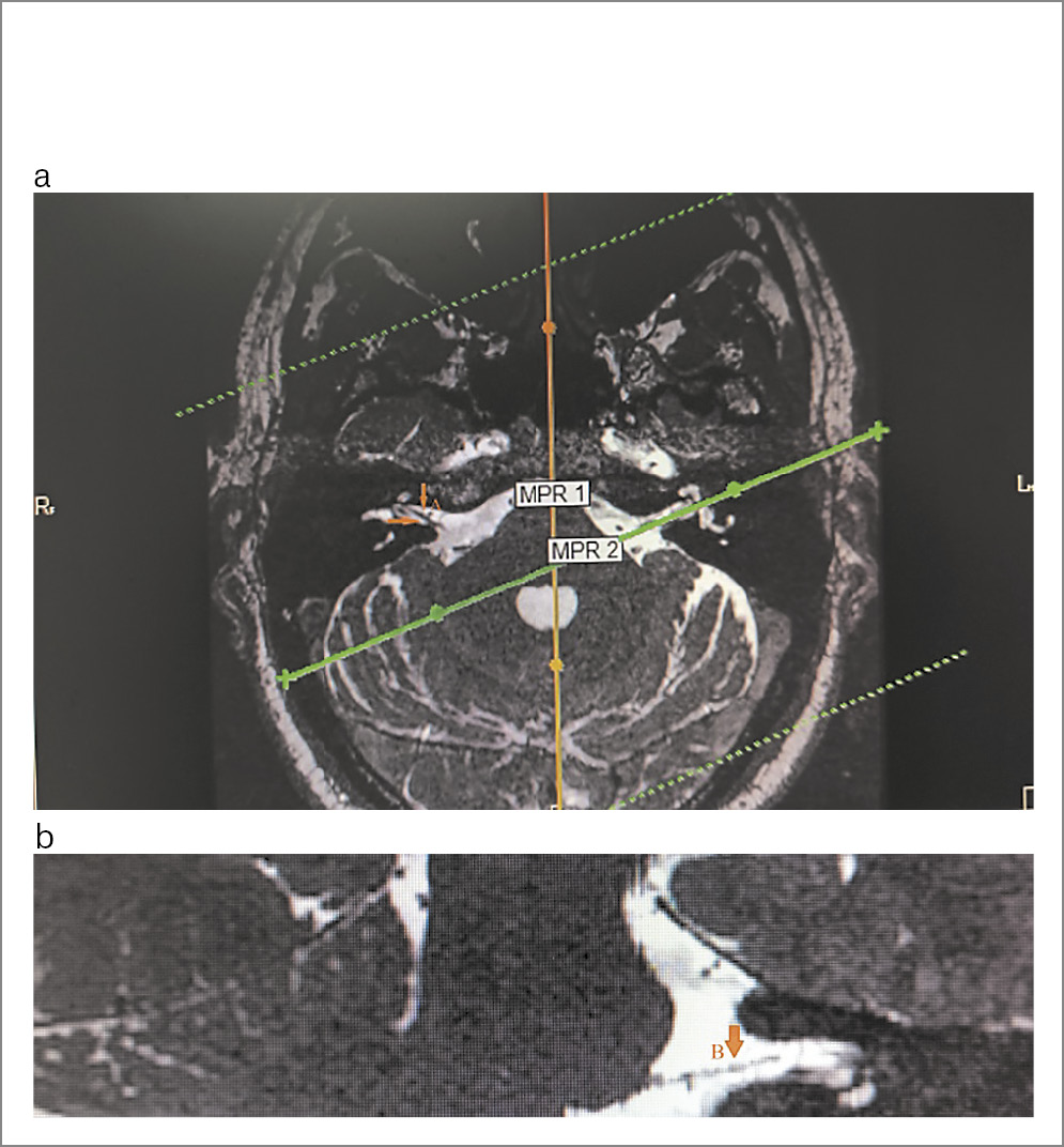 Рис. 3. Лицевой нерв на МРТ черепных нервов: а – правый лицевой нерв; b – левый лицевой нерв.