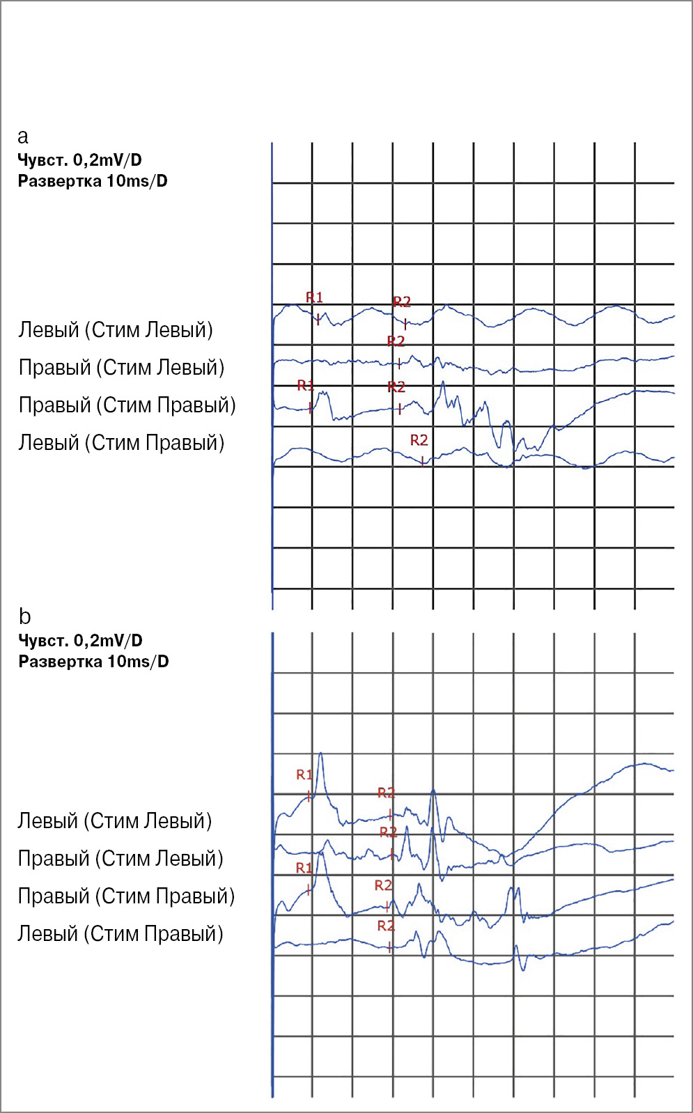 Через 2 месяца после выписки из стационара проведена контрольная ЭНМГ: ЭНМГ-признаки последствий невропатии левого лицевого нерва с восстановлением проведения по дуге мигательного рефлекса. Наблюдались значимое повышение амплитуд ранних и поздних ответов и нормализация латентности раннего и позднего ипсилатеральных ответов при стимуляции слева (рис. 4, b). Легкая контрактура мимических мышц слева, более выраженная в лобной мышце (до 20% от амплитуды максимальной произвольной активации). В неврологическом статусе наблюдалась легкая сглаженность носогубной складки слева.