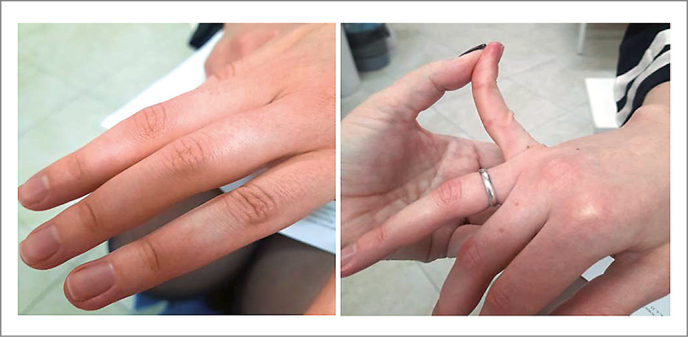На приеме ревматолога женщина, 43 года, предъявляет жалобы на боли во II и III проксимальных межфаланговых суставах (ПМФС) правой кисти больше при движении по визуальной аналоговой шкале (ВАШ)=35 мм. Из анамнеза известно, что боли появились около 2 мес назад постепенно, стала отмечать их после избыточной нагрузки (работа за компьютером). Ранее отмечала периодические боли в коленном суставе 1–2 дня, частые подвывихи в голеностопных суставах. Из сопутствующих состояний – миопия, правосторонний нефроптоз, хронических заболеваний нет. Наследственность отягощена – у мамы ОА (коленных, тазобедренных суставов, суставов кистей).