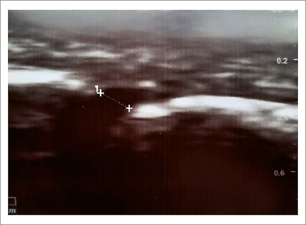 При дальнейшем осмотре суставов пациентки выявлено пассивное переразгибание суставов и позвоночника, что соответствовало 9 баллам по шкале Бэйтона. Учитывая исключение другой ревматической патологии, а также соответствие брайтоновским критериям: 1 большой (счет по шкале Beighton ≥4 из 9 баллов на момент осмотра) и 2 малых (артралгии в 1–3 суставах или люмбалгия >3 мес и вывихи/подвывихи в >1 суставе или повторный вывих в 1 суставе), поставлен предварительный диагноз – СГМС. С целью уточнения диагноза и диагностики раннего ОА, для уточнения состояния хряща пациентке проведена ультразвуковая диагностика суставов кистей. При исследовании на первом визите: хрящ обычной эхогенности, однородный, лоцируется жидкость толщиной около 1,1 мм (рис. 2).