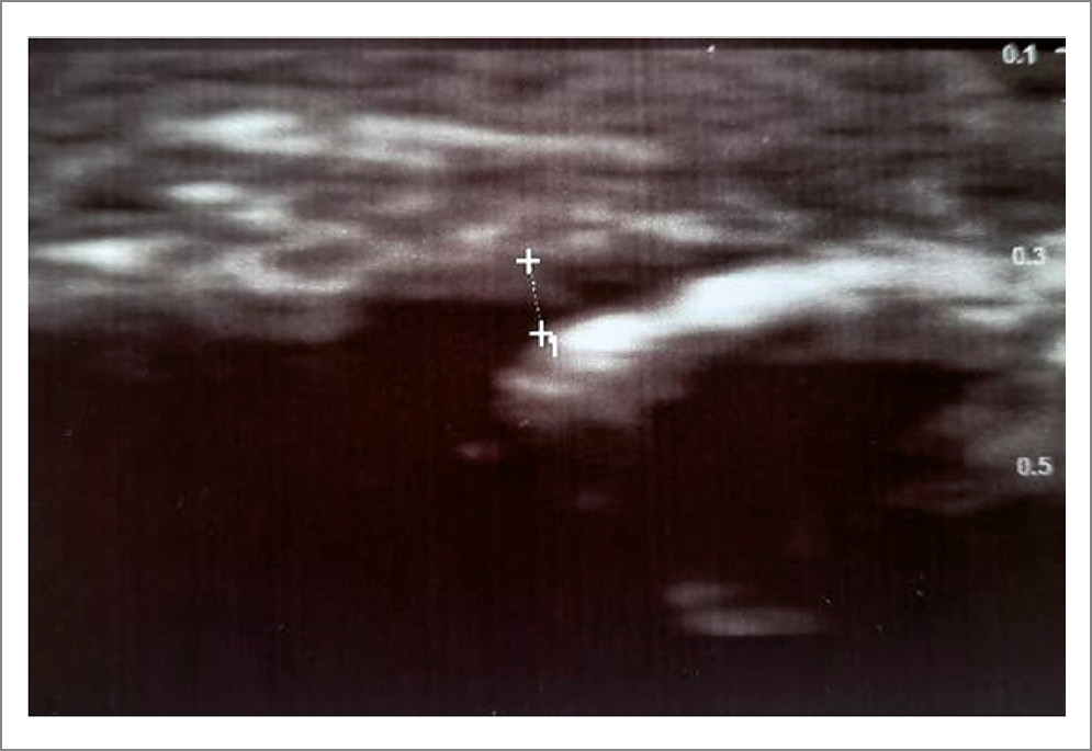 При осмотре экссудативных явлений в суставах нет, пальпация ПМФС безболезненная. При повторном ультразвуковом исследовании отмечается уменьшение жидкости. Заключение: хрящ обычной эхогенности, однородный. Лоцируется жидкость толщиной около 0,7 мм (рис. 3).