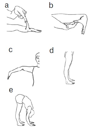 5. Наклон вперед при фиксированных коленных суставах, при этом ладони достигают пола (e) | |