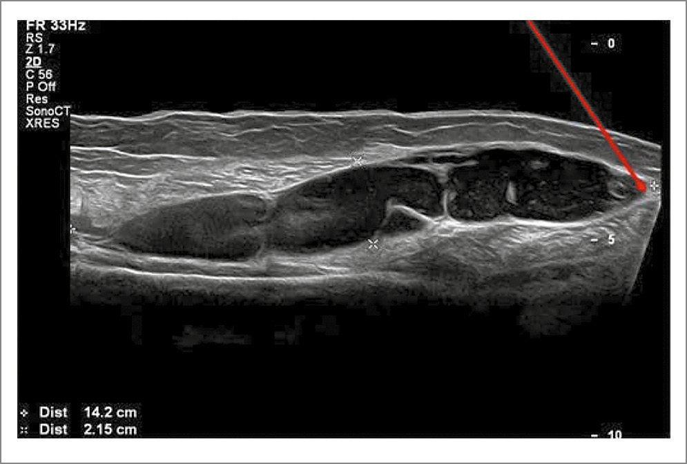 Ультразвуковая верификация разрыва КБ может быть затруднена, если на момент исследования киста уже находится в спавшемся состоянии, а ее содержимое поглощено окружающими тканями. В таких случаях рекомендовано искать жидкость между медиальной головкой икроножной мышцы и сухожилием полуперепончатой мышцы [17, 18].