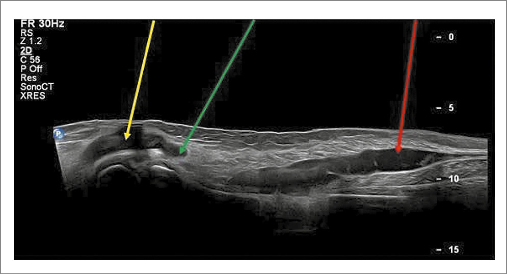 Рис. 2. Разрыв КБ. Распространение содержимого в межфасциальное пространство заднего отдела голени (красная стрелка). Остаточное содержимое в кисте (желтая стрелка). Зона разрыва (зеленая стрелка).
