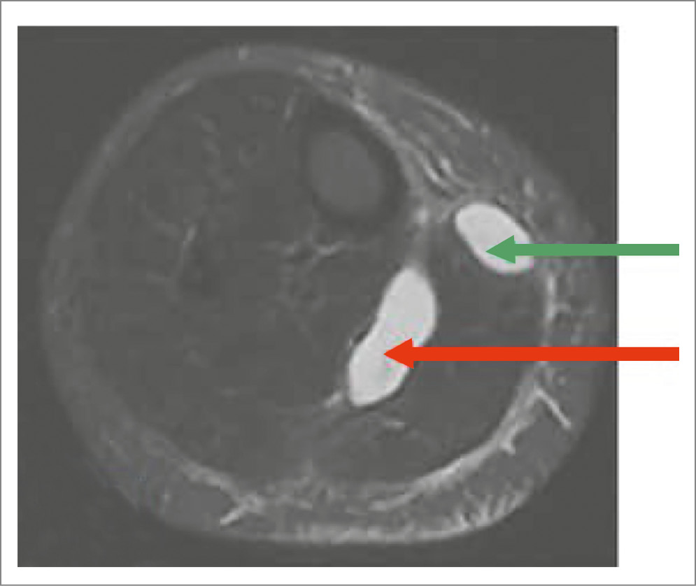 Рис. 3. МРТ голени, аксиальный срез, Т2-ВИ STIR. Разрыв КБ с истечением содержимого подкожно (зеленая стрелка) и межмышечно, сепарация медиальной головки икроножной мышцы (красная стрелка).