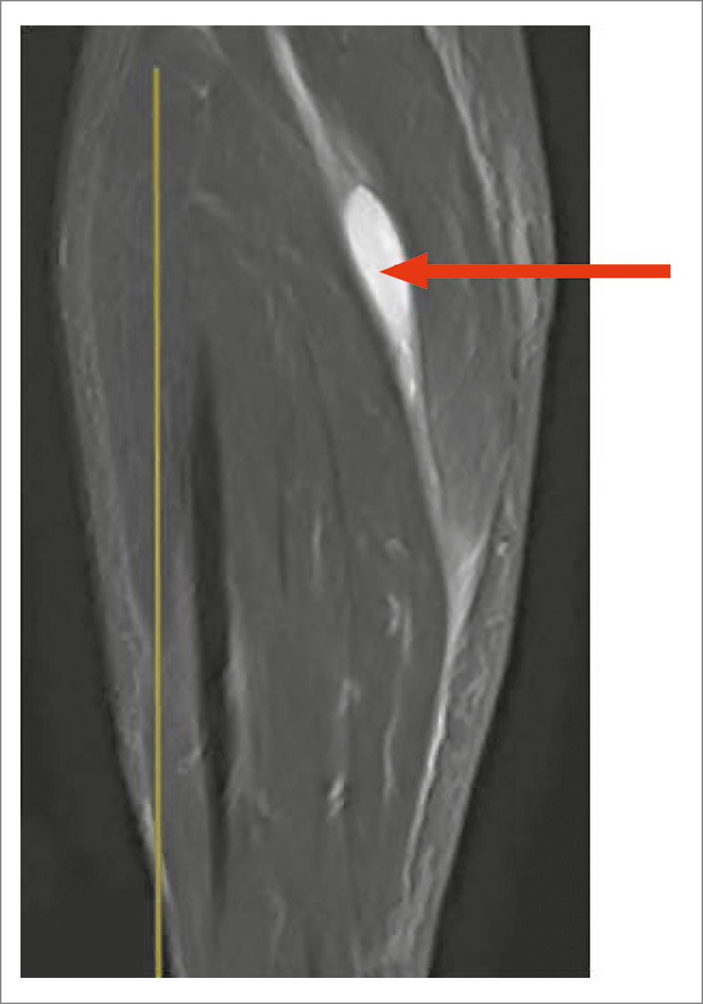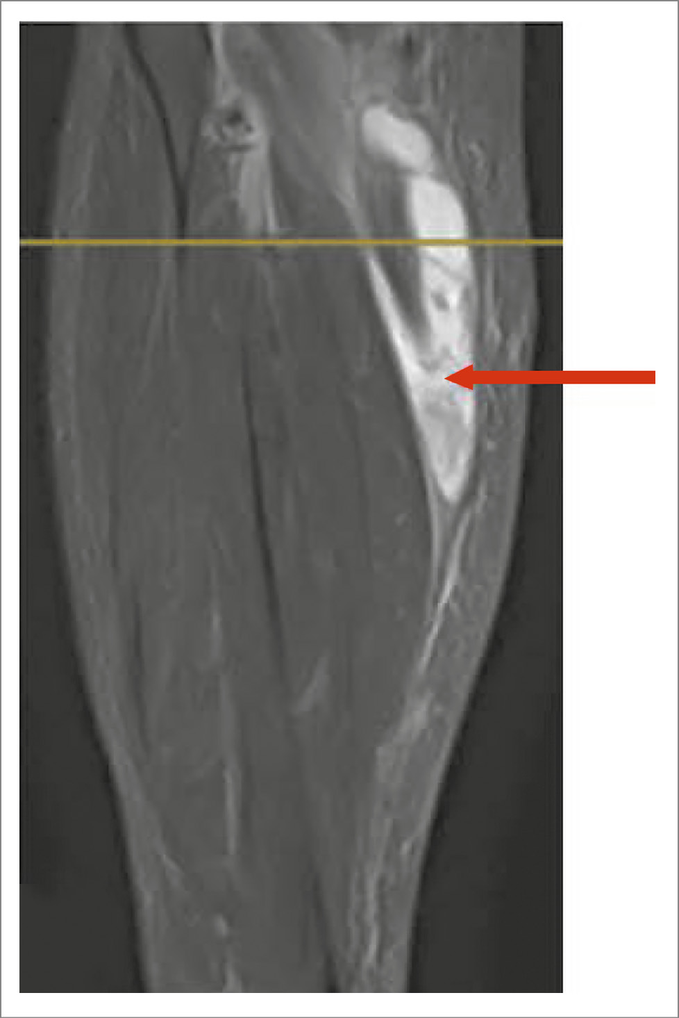 Рис. 5. МРТ голени, коронарный срез, Т2-ВИ STIR. Разрыв КБ, истечение жидкости в межмышечное пространство голени (красная стрелка).