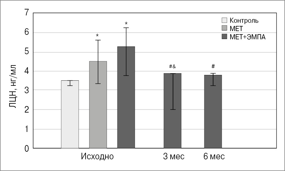 Исходный уровень маркера нейронального повреждения ЛЦН оказался достоверно выше у пациентов с СД 2 (группы «МЕТ» и «МЕТ+ЭМПА»), чем у здоровых добровольцев (группа «Контроль»). Различия в исходном уровне ЛЦН между группами «МЕТ» и «МЕТ+ЭМПА» не выявлены. Комбинированная терапия МЕТ и ЭМПА привела к достоверному снижению концентрации ЛЦН уже через 3 мес лечения и поддержанию данного показателя на уровне, не отличном от такового в группе «Контроль» (рис. 1).