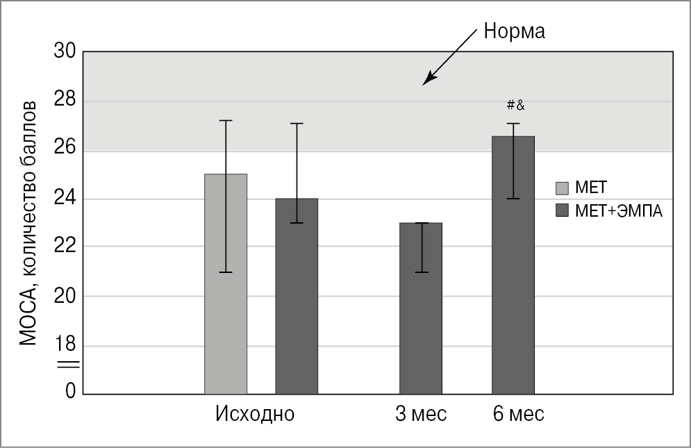 Пациенты как группы «МЕТ», так и группы «МЕТ+ЭМПА» исходно демонстрировали снижение когнитивных функций при оценке при помощи шкалы МОСА (рис. 2). Добавление к терапии ЭМПА привело к нормализации когнитивного статуса через 6 мес.