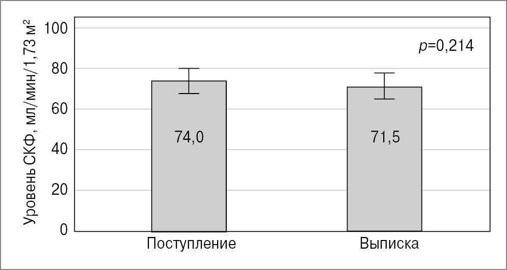 ОПП, характеризующееся снижением СКФ, рассчитанной по формуле CKD-EPI, на 25% и более, развилось у 4 (9,3%) пациентов (см. рис. 1), оно не зависело от этиологии ХСН, ФК, наличия или отсутствия СД 2, приема АРНИ, потребности в усилении диуретической терапии, гипотонии (p>0,05 для всех показателей). При этом не отмечено снижения СКФ<15 мл/мин/1,73 м2. Также между поступлением и выпиской из стационара не отмечено выявленного статистически значимого снижения уровня СКФ (p=0,214), до лечения среднее значение – 74±19,8, после – 71,5±21,4 мл/мин/1,73 м2 (рис. 4). Различия уровня СКФ при выписке в зависимости от необходимости в увеличении диуретической терапии, ОПП являлись статистически не значимыми (p>0,05). При сравнении с помощью t-критерия Стьюдента пациентов с гипотонией и без по уровню СКФ при выписке установлены статистически значимые различия (p=0,04). Уровень СКФ при выписке среди пациентов с гипотонией оказался существенно ниже, чем у пациентов без таковой: средние составляли 60,8±25,7 мл/мин/1,73 м2 (95% ДИ 42,4–79,3) и 73,7±20 мл/мин/1,73 м2 (95% ДИ 66,6–80,8) соответственно. При подсчете уровня креатинина наблюдалась тенденция к увеличению: до лечения – 93,7 мкмоль/л (Q1–Q3: 78–114,9), после – 102,2 мкмоль/л (Q1–Q3: 77,1–113,2), однако также статистически не значимая (p=0,173); рис. 5.