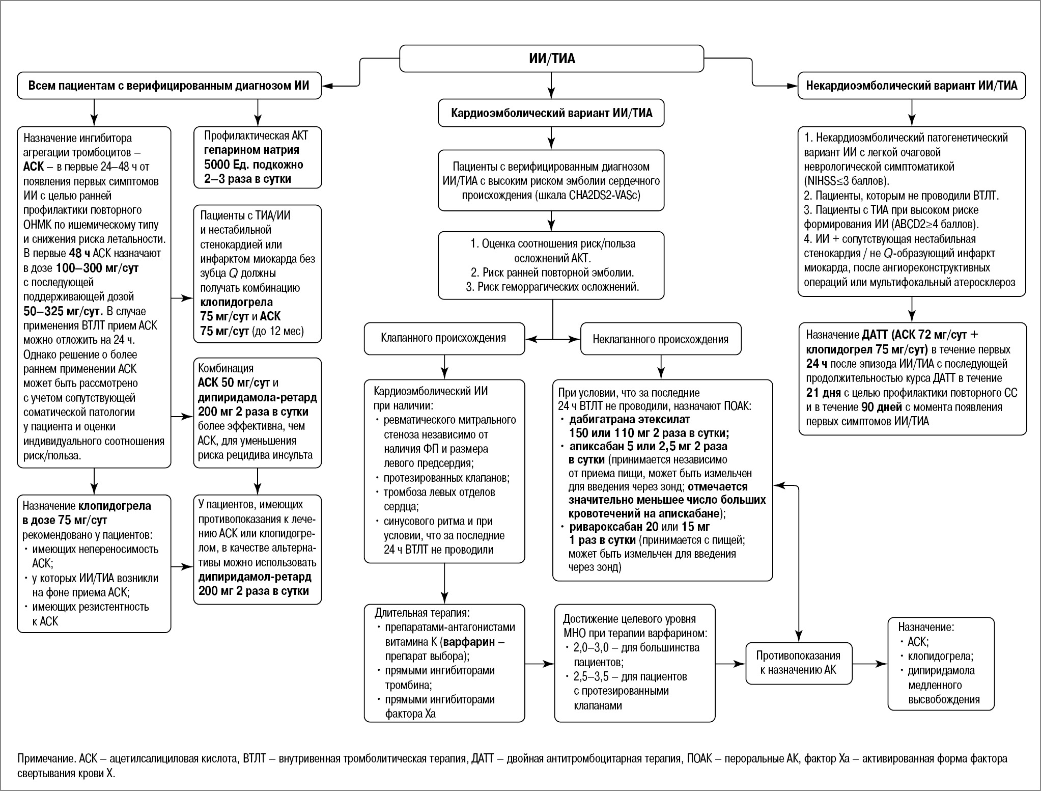 Таким образом, выбор назначения АТТ у больных с ОНМК в настоящее время представляет собой сложный дифференцированный алгоритм, опирающийся на индивидуальные особенности пациента и начинающийся с проявления первых клинических симптомов заболевания с последующим продолжением приема терапии в течение всей жизни пациента. Необходимо отметить, что при ИИ в период ранней вторичной профилактики (первые 90 дней от момента события) у пациента отмечается более высокая вероятность развития вторичных тромботических осложнений, соответственно, требуются более активное наблюдение и ведение пациента. В более позднем периоде (поздний восстановительный период и период резидуальных явлений) на первое место выходит вопрос безопасности применения АТТ, а схема приема может быть скорректирована в сторону редукции. В случае кардиоэмболического характера ИИ АКТ назначают пожизненно.
