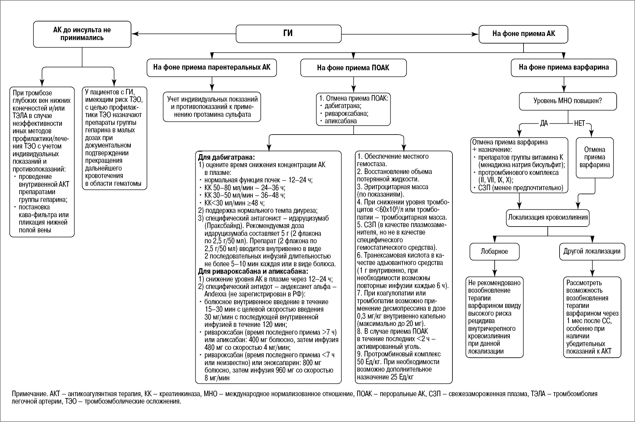 На основе обзора клинических рекомендаций мы составили алгоритм выбора применения АТТ у пациентов с ИИ и ТИА (рис. 1) [3, 12–20], а также алгоритм проведения АТТ у пациентов с ГИ [7, 21–24] с целью профилактики тромбоэмболических осложнений (рис. 2), поскольку согласно актуальной нормативной базе при ГИ рекомендуется возобновление АТТ пациентам, которые до ГИ принимали данные препараты при сохранении показаний. Однако срок возобновления нужно определять индивидуально в каждом случае, так как существующих данных недостаточно для установления оптимальных сроков возобновления АТТ.