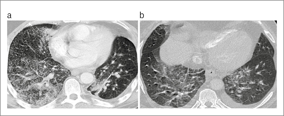 Рис. 1. КТ ОГК. Аксиальная проекция, режим легочного окна: a – пациент 42 лет с IVВ-стадией ВИЧ-инфекции с ИД, в фазе прогрессирования, без АРВТ и с верифицированной коморбидностью ДТЛ, КВП и ПЦП; b – пациент 39 лет с IVВ-стадией ВИЧ-инфекции с ИД, в фазе прогрессирования, без АРВТ и с верифицированной коморбидностью ДТЛ и ПЦП.