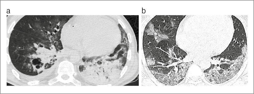 Рис. 2. КТ ОГК. Аксиальная проекция, режим легочного окна: a – пациент 39 лет с IVВ-стадией ВИЧ-инфекции с ИД, в фазе прогрессирования, без АРВТ и с верифицированной коморбидностью ДТЛ, КВП и ПКП; b – пациент 36 лет с IVВ-стадией ВИЧ-инфекции с ИД, в фазе прогрессирования, без АРВТ и с верифицированной коморбидностью ДТЛ и ПКП.