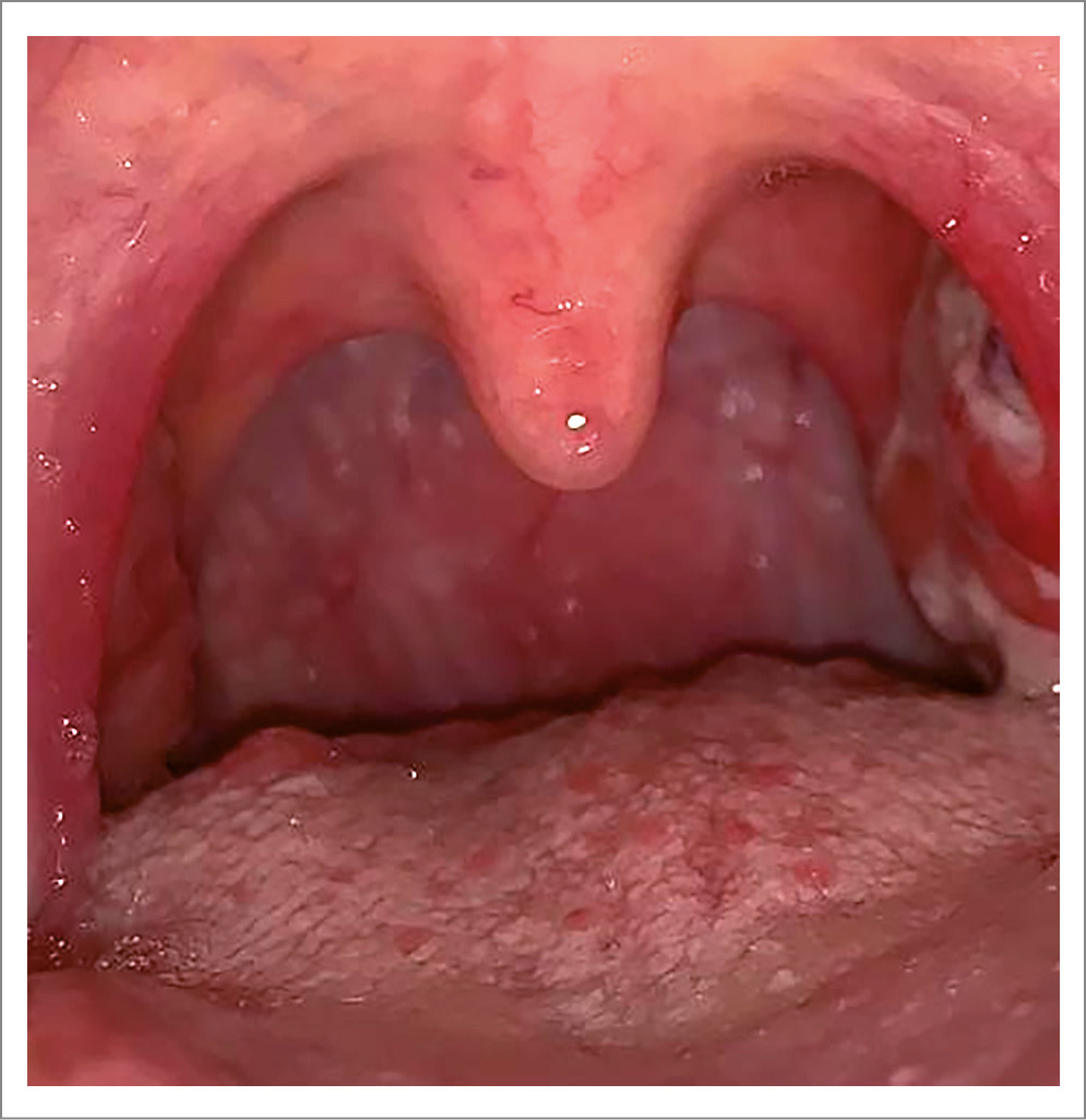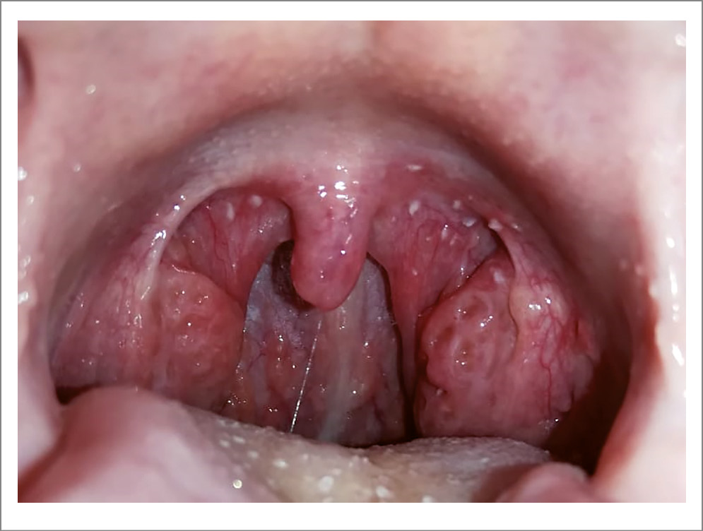 Пациент 16 лет. В анамнезе: несколькими месяцами ранее имелся эпизод перенесенной новой коронавирусной инфекции (COVID-19), наблюдение у врача-оториноларинголога по поводу хронического тонзиллита. Присутствовали жалобы на боль в горле, парестезии и покалывания в языке, нарушение вкусовых ощущений, слизисто-гнойные выделения из полости носа. В течение нескольких дней отмечалась фебрильная температура тела. В ходе диагностики выявлены антитела класса G к вирусу герпеса I и II типов. По результатам микробиологического обследования выявлено присутствие β-гемолитического стрептококка группы А. Рентгенологическое исследование околоносовых пазух во фронтальной проекции указывало на наличие уровня жидкости в верхнечелюстных пазухах. По результатам общего анализа крови выявлены лейкоцитоз, повышение СОЭ. При фарингоскопии – гиперемия слизистой оболочки глотки, миндалин, расширенные лакуны (рис. 6).
