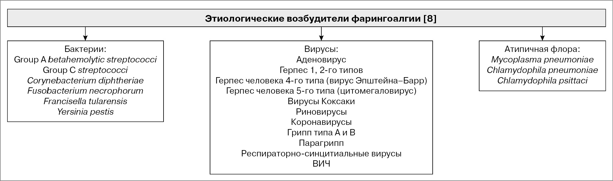 Ведущими причинами фарингоалгии являются вирусные агенты, а также представители атипичной флоры (рис. 1). Наиболее часто возбудителями острого тонзиллофарингита становятся респираторные вирусы – аденовирус, вирус Эпшейна–Барр, вирус парагриппа, респираторно-синцитиальный вирус, риновирус, бокавирус, метапневмовирус и др. [9].