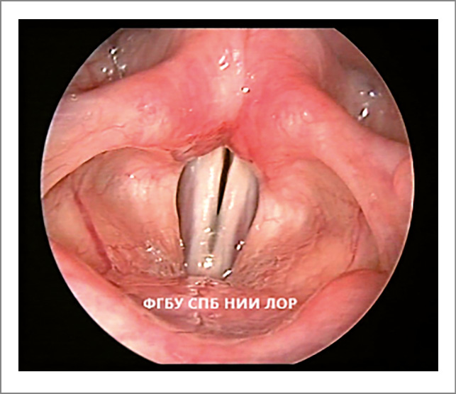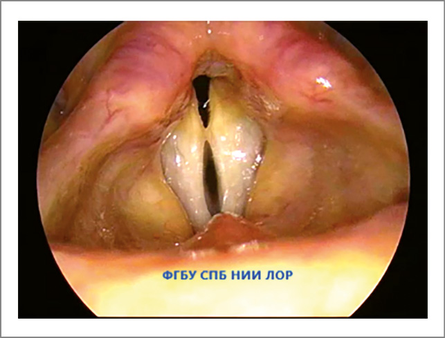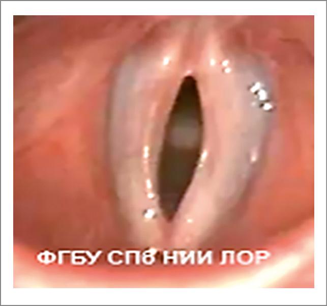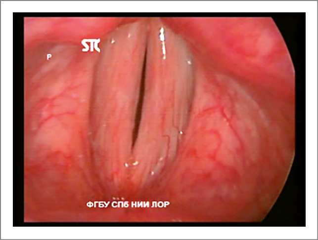 Рис. 3. Функциональная дисфония по гипотонусному типу (вдох): зияние гортанных желудочков, недостаточное натяжение медиального края голосовых складок.
