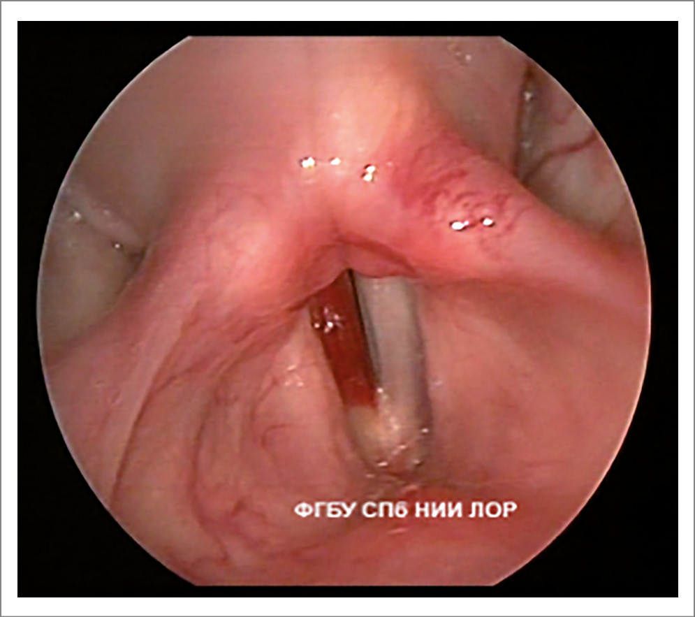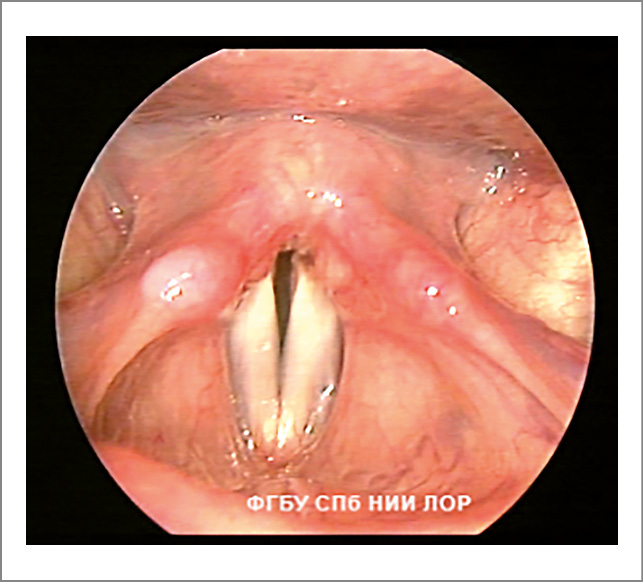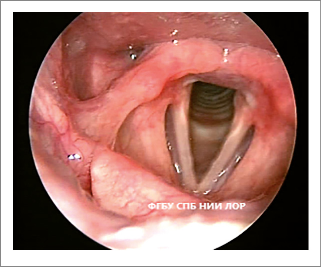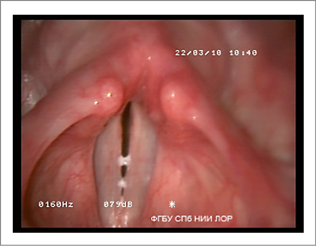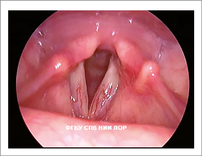 Рис. 7. Острый профессиональный ларингит (фонация): овальная щель, сосудистая инъекция слизистой оболочки гортани.