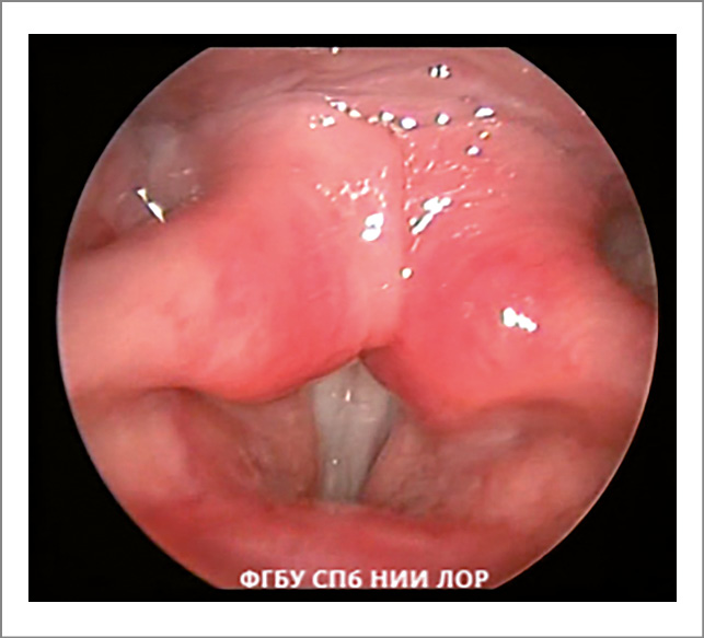 В стадии ремиссии ларингита пациенты жалуются на утомляемость голоса, периодическую осиплость, ощущение сухости и дискомфорта в глотке, постоянное желание откашляться после голосовой нагрузки. Для видеоэндостробоскопии характерны умеренная отечность слизистой оболочки голосовых складок, выраженная инъекция сосудов, слизь на голосовых складках во время фонации (рис. 8). Тонус голосовых складок снижен, колебания асимметричные, нерегулярные, слизистая волна уменьшена. Диагностируется патологическая форма голосовой щели (широкая линейная, овальная, треугольная) [9, 16].