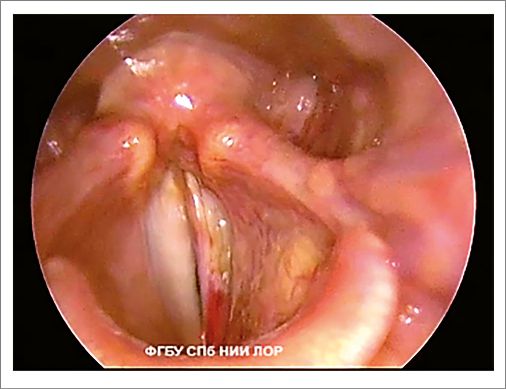 Рис. 9. Капилляроэктазии голосовых складок с ангиоматозной дилатацией, отек медиальных краев голосовых складок (вдох).