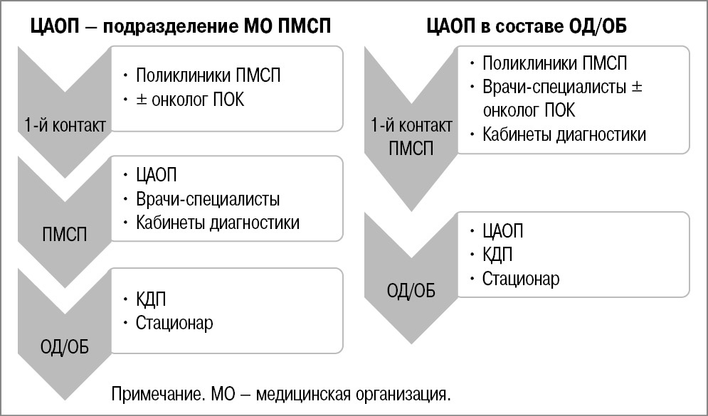 В первом варианте ЦАОП является частью медицинской организации, оказывающей ПМСП, во втором – ЦАОП функционирует как структурное подразделение специализированного онкологического учреждения. Оба варианта могут быть взяты за основу при построении системы региональной маршрутизации по профилю «онкология». Согласно положениям Порядка ЦАОП принципиальным образом отличается от ранее имевшихся амбулаторных онкологических подразделений наличием собственных возможностей как клинической, так и лабораторно-инструментальной диагностики. Таким образом, модель взаимоотношений ЦАОП и поликлиник ПМСП и региональных ОД/ОБ заново формирует этапы оказания онкологической помощи в регионе и является ключевым механизмом, обеспечивающим доступность и качество онкологической помощи.