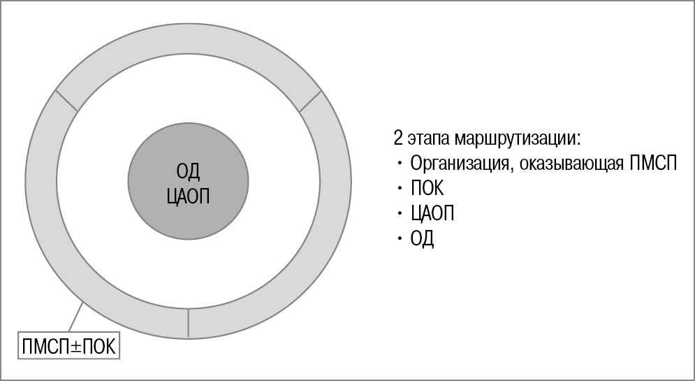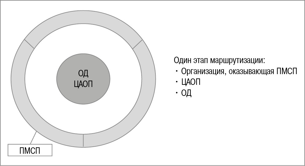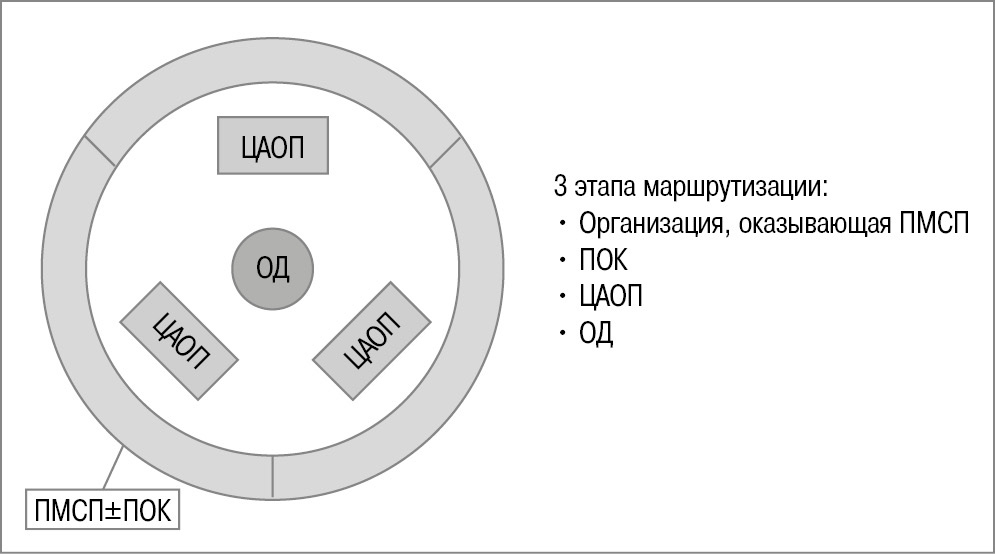 Модель маршрутизации №1 основана на первой базовой схеме. В представленной на рис. 2 модели региональной маршрутизации четко выделяются 3 этапа. Два из них относятся к первичному звену – собственно организации ПМСП, включая наличие/отсутствие врача-онколога ПОК и ЦАОП – как подразделение многопрофильной городской или районной поликлиники. Третий этап представлен региональным ОД.