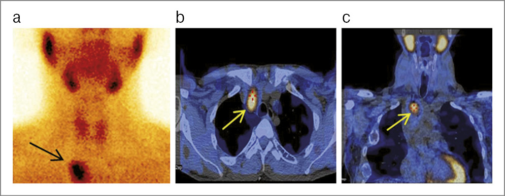 Рис. 1. Пациент П., 58 лет. а – планарная сцинтиграфия шеи и средостения, b, с – гибридное исследование ОФЭКТ/КТ, совмещенное изображение, аксиальные и корональные срезы. На представленных изображениях очагу гиперфиксации соответствует неоднородное мягкотканное образование в верхнем средостении размерами 27,7×26,0×33,0 мм, расположенное паратрахеально справа, с достаточно четким контуром. Заключение: сцинтиграфические признаки эктопированной в центральное средостение гиперфункционирующей аденомы паращитовидной железы.