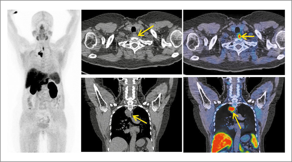 Рис. 2. Пациентка А., 59 лет. На MIP ПЭТ/КТ, аксиальных и корональных КТ- и ПЭТ/КТ-срезах с 18F-холином кзади от левой доли щитовидной железы, у стенки шейного отдела пищевода (уровень СVII) визуализируется метаболически активный очаг размерами 8×8×16 мм, SUVmax 6,0. Аналогичное образование на уровне ТhI–ТhIII справа, распространяется пара/ретротрахеально в заднее средостение размерами до 29×15×47 мм, SUVmax 10,6. Заключение: аденомы эктопированных паращитовидных желез в стенке шейного отдела пищевода слева и в заднем средостении справа.