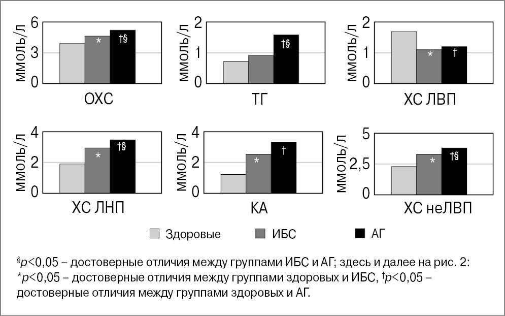 В настоящем исследовании развитие АГ и ИБС ассоциировалось с мужским полом, курением, абдоминальным ожирением, нарушенным липидным и углеводным обменом. Поскольку обследование пациентов с ИБС проводилось на фоне медикаментозного лечения, выявленная дислипидемия указывает на неадекватную гиполипидемическую терапию.