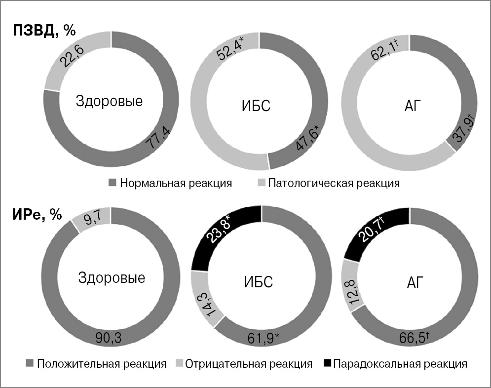 Результаты пробы с постокклюзионной реактивной гиперемией продемонстрировали сопоставимо высокую частоту патологических значений ПЗВД у пациентов с ИБС и АГ. При анализе ИРе отрицательная и парадоксальная реакции также преобладали во 2 и 3-й группах (рис. 2).