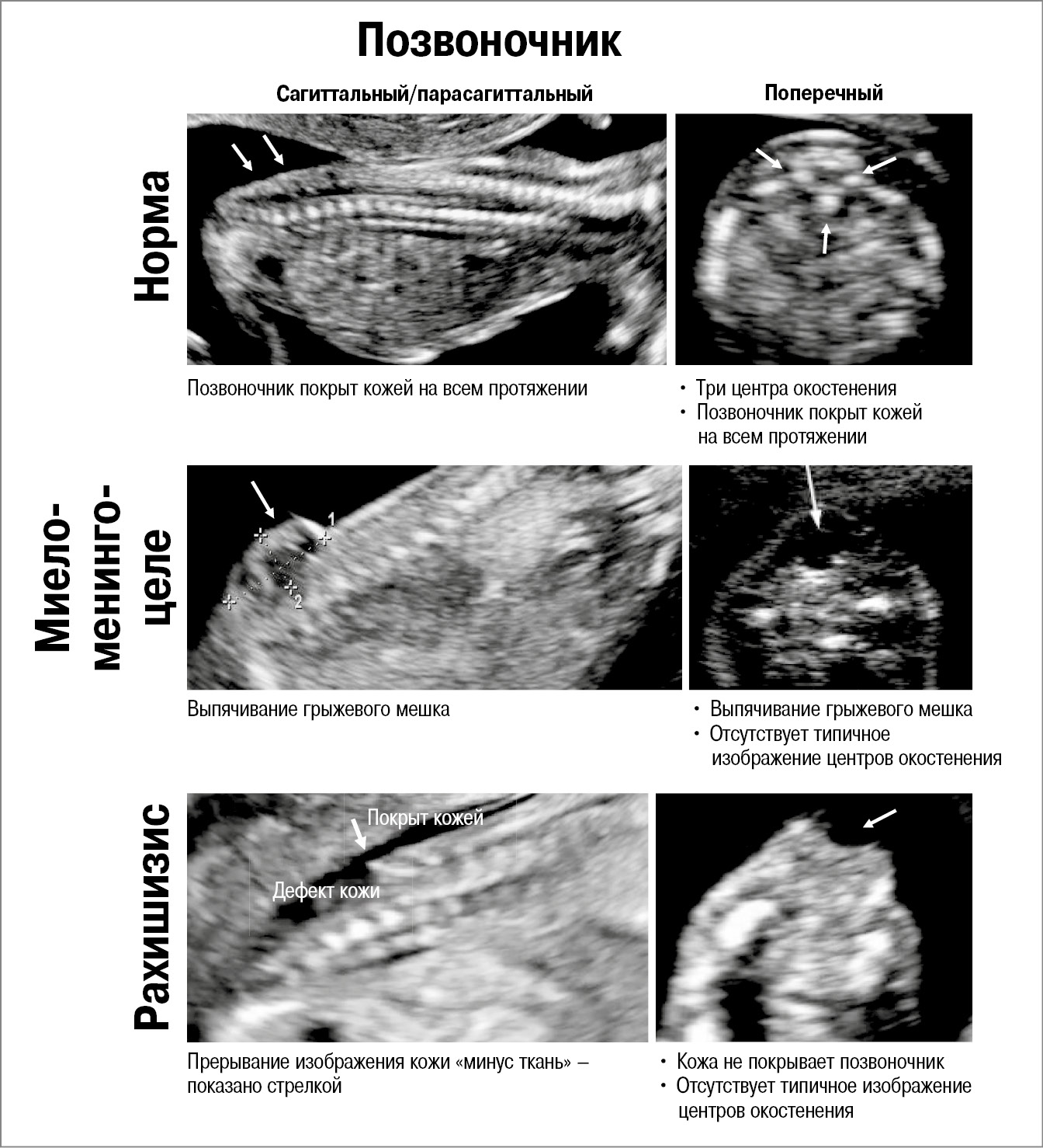 Рис. 3. Ультразвуковые признаки открытой spina bifida в I триместре беременности (11–14 нед). Оценка позвоночника.