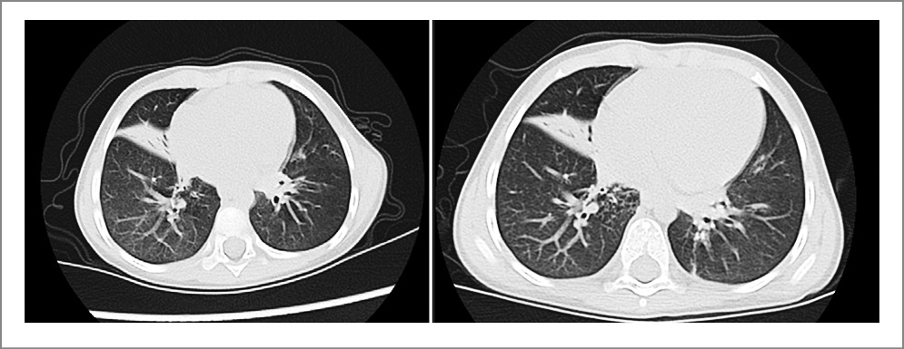 Рис. 1. КТ-динамика пациентки с первичной цилиарной дискинезией до и через 1 год после СOVID-19.