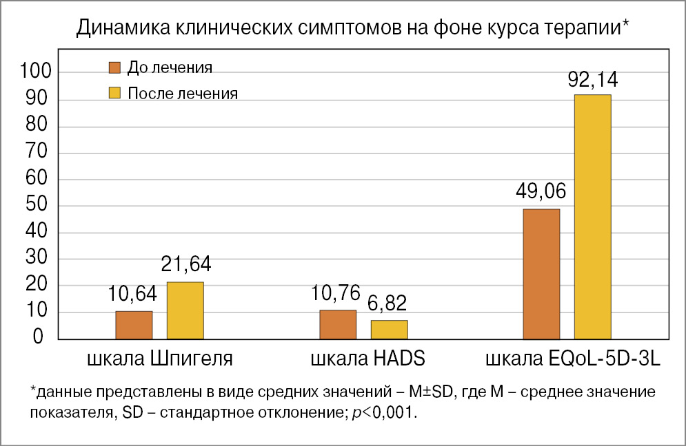 Динамика показателей психоэмоционального состояния, сна и выраженности астении связана с качеством жизни – в исследовании достоверно показано улучшение жизнедеятельности пациентов, что проявилось в повышении общей активности, физической и умственной работоспособности, уровня бытовой и социальной адаптации.