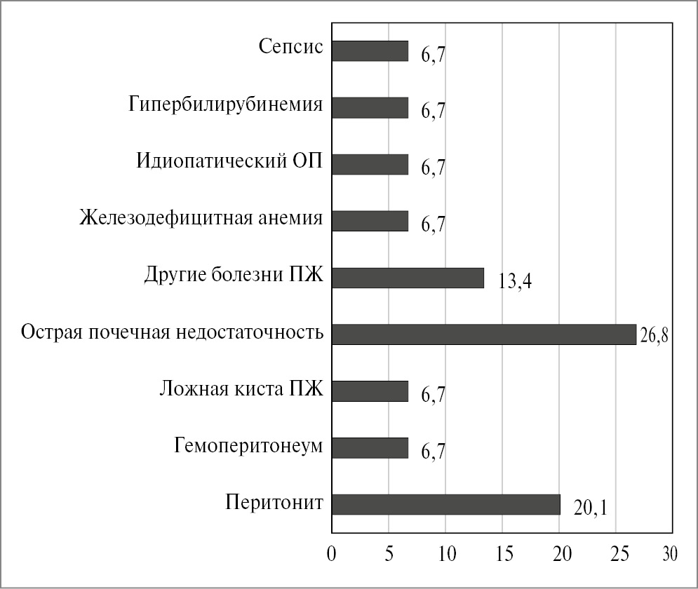 Как видно из рис. 1, в структуре осложнений преобладает острая почечная недостаточность (26,8% случаев), в 20,1% случаев отмечался перитонит, в 13,4% случаев развивались другие болезни ПЖ. В отдельных случаях фиксировали такие осложнения, как гипербилирубинемия, идиопатический ОП, железодефицитная анемия, ложная киста ПЖ, сепсис.