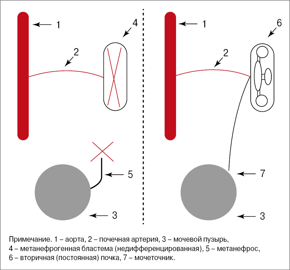 Дивертикул мочевого пузыря (ДМП) – это слепо оканчивающееся мешковидное выпячивание стенки мочевого пузыря с вовлечением мышечного слоя или без такового. ДМП чаще всего располагается в области устьев мочеточников и боковых стенок мочевого пузыря, реже – на верхушке или в области дна. ДМП могут быть одиночными и множественными, истинными (врожденными) и ложными (приобретенными). Частота истинных ДМП невелика – примерно 1,7%. Истинные дивертикулы развиваются во время беременности под воздействием на плод неблагоприятных факторов. В таких условиях ДМП могли сопутствовать редко встречающиеся сочетания аномалий верхних мочевых путей, включая гомолатеральную аплазию почки и мочеточника [1, 2]. Сочетание аплазии почки и врожденного ДМП относится к порокам развития, связанным с нарушением индуцирующего влияния протока метанефроса на метанефрогенную бластему; рис. 1 [3].