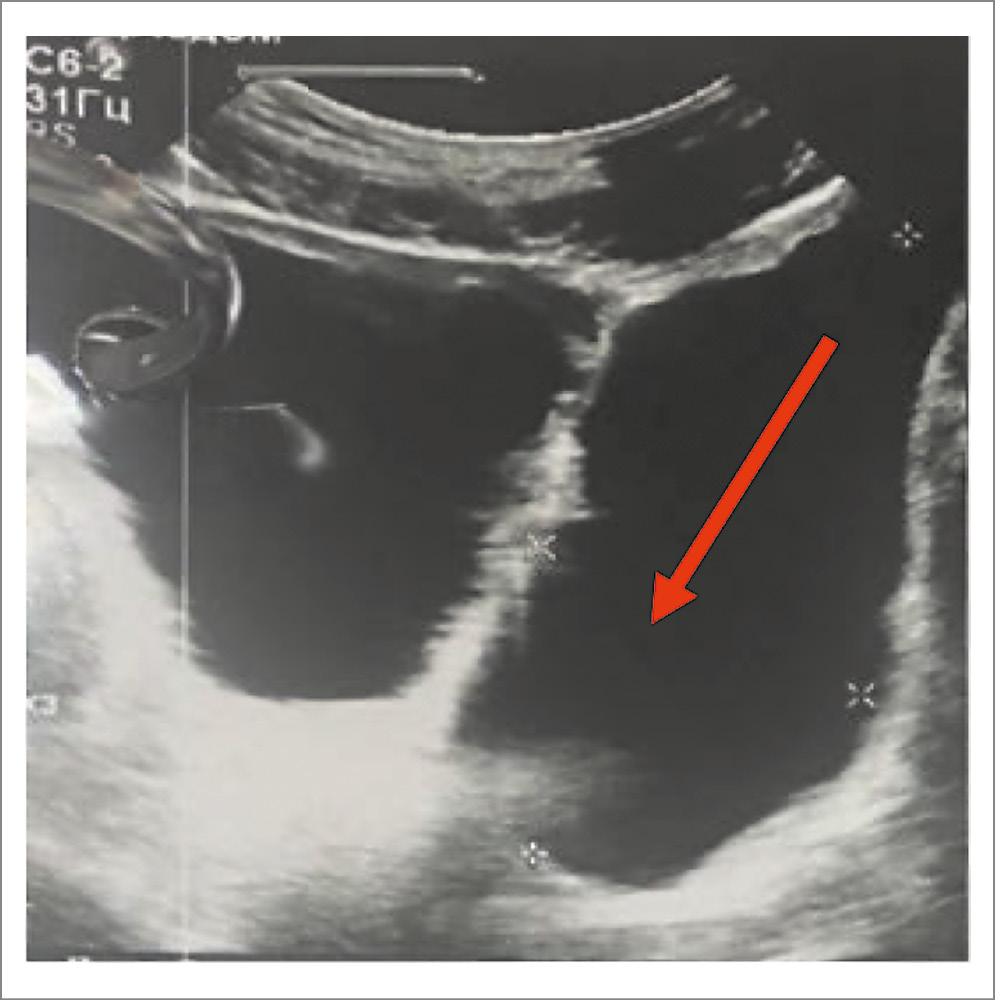 Рис. 2. Пациент В., ультрасонограмма мочевого пузыря. Стрелкой указан ДМП.