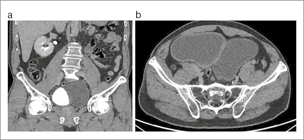Рис. 3. Пациент В., компьютерная томограмма живота и таза: a – аплазия левой почки, ДМП; b – ДМП.