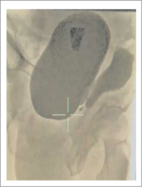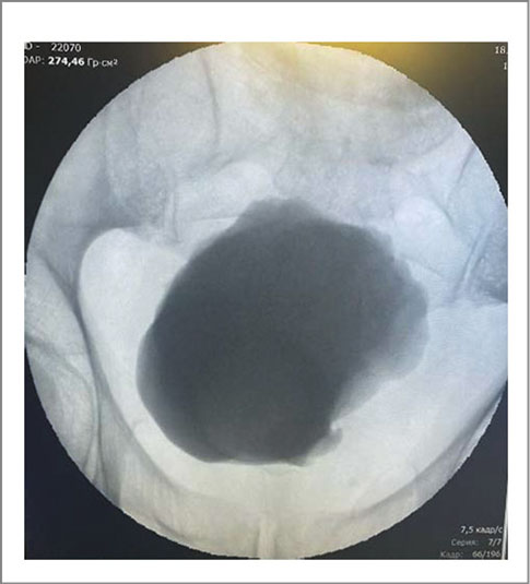 Послеоперационный период протекал гладко. Цистостомический дренаж удален на 3-и сутки, уретральный катетер – на 12-е. После удаления катетера самостоятельное мочеиспускание восстановилось. Урофлоуметрия: максимальная скорость мочеиспускания – 16,0 мл/с, средняя – 9 мл/с. При УЗИ мочевого пузыря: объем мочевого пузыря 350 мл, остаточной мочи нет. По данным ретроградной цистографии затеков не выявлено (рис. 8).