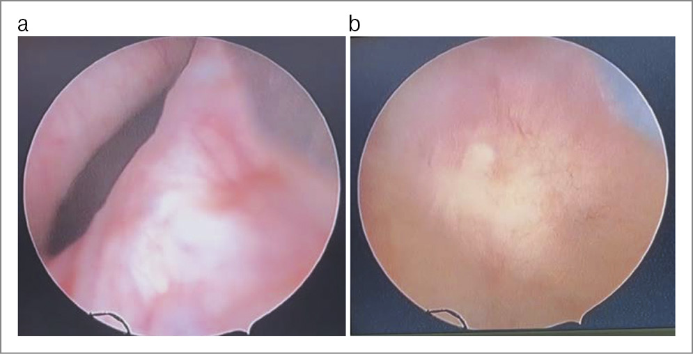 Рис. 6. Пациент В., фиброуретроцистодивертикулоскопия: a – устье ДМП; b – стенка ДМП.