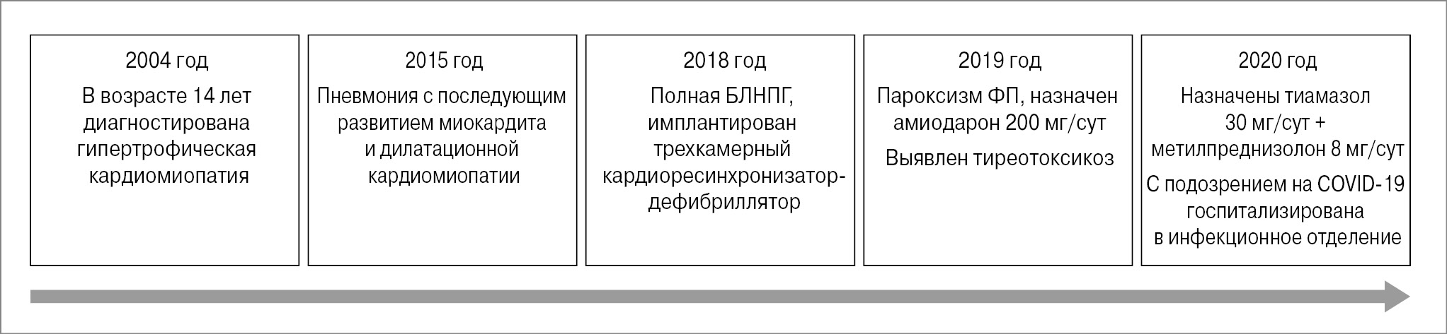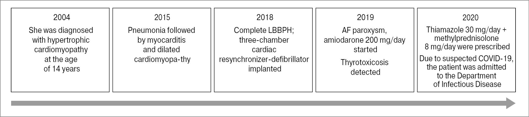 Patient N., 30 years old, was admitted to the Department of Infectious Disease with suspected COVID-19 in May 2020 with dyspnea, shortness of breath, palpitations, dizziness, and fever up to 38.5°C for 4 days. She had a history (Fig. 1) of hypertrophic cardiomyopathy diagnosed in 2004 at the age of 14 years. In 2015, she had pneumonia complicated by myocarditis. Subsequently, she not-ed periodic edema of the lower extremities and dyspnea during physical exertion. Echocardiography showed a decrease in LVEF up to 30%, and dilated cardiomyopathy was diagnosed. Since 2018, a complete left bundle branch block (LBBB) has been recorded, for which a three-chamber cardiore-synchronizer-defibrillator was implanted. In 2019, a paroxysm of tachysystolic AF occurred, medi-cally corrected with amiodarone. The drug was administered continuously to maintain sinus rhythm. Over the past year, repeated paroxysms of AF occurred, controlled by electric cardioversion.
