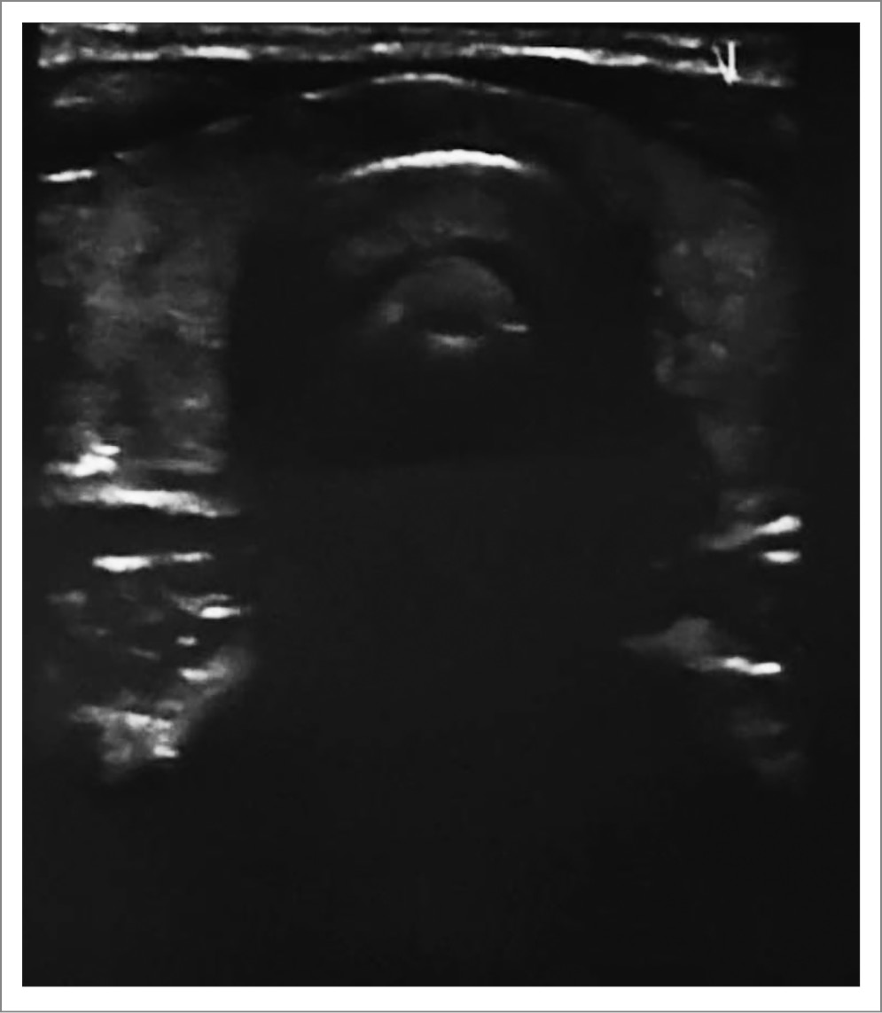 Fig. 2. Ultrasound of the thyroid gland. The thyroid gland volume was not increased, and a reduced echogenicity of the parenchyma was visualized.