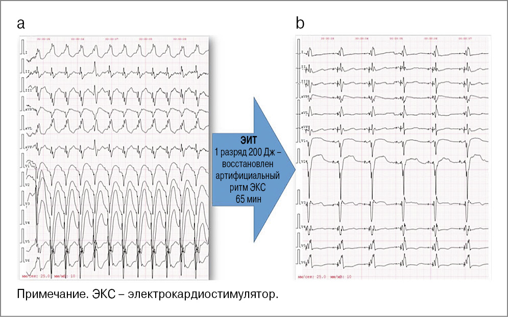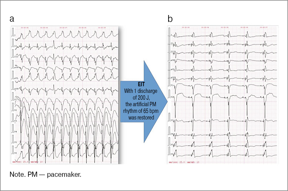 Fig. 3. Electrocardiograms before (a) and after (b) the EIT: a – AFL with an atrial contraction rate of 271 per minute and a ventricular contraction rate of 2:1; a ventricular contraction rate of 144 per minute; complete LBBPH; b – an artificial rhythm of atrial ventricular stimulation, with a heart rate of 65 beats per minute.