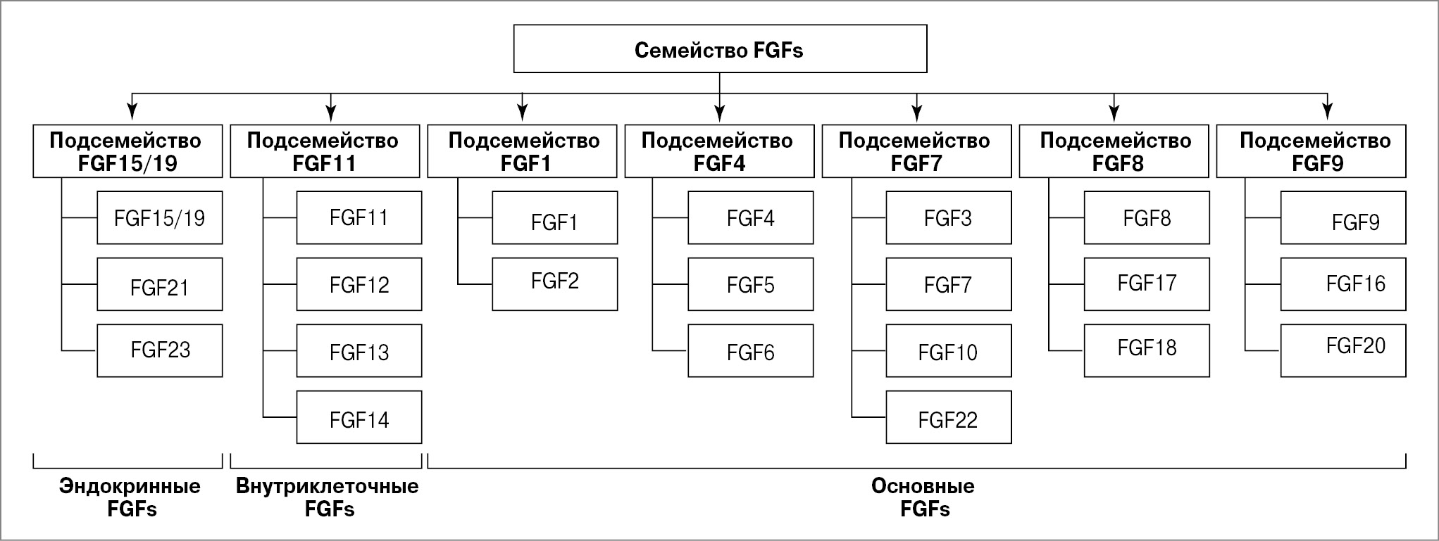 Семейство FGFs включает 22 члена, участвующих в дифференцировке, пролиферации клеток и эмбриональном развитии. Согласно филогенетическому анализу, члены семейства FGFs могут быть разделены на 7 подсемейств (рис. 1) [7, 8].