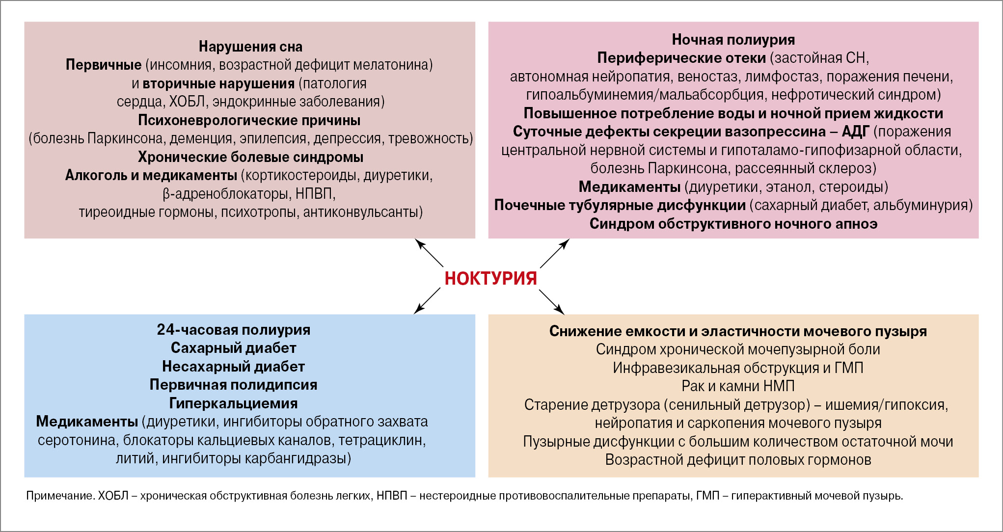 Современный патогенез ноктурии является сложным и мультифакторным. В настоящее время выделяют 4 основные группы причин ноктурии [11]: