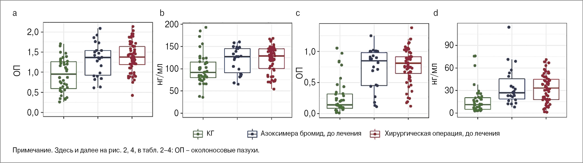 Пациенты с ХРС из группы, планирующей хирургическое вмешательство (n=60), и из группы, планирующей только прием азоксимера бромида (n=22), по возрасту, полу (см. табл. 1), оптической плотности (ОП) комплексов МПО-ДНК, количеству внеклеточной дсДНК в сыворотке крови и назальных смывах не отличались между собой (табл. 2, рис. 1).