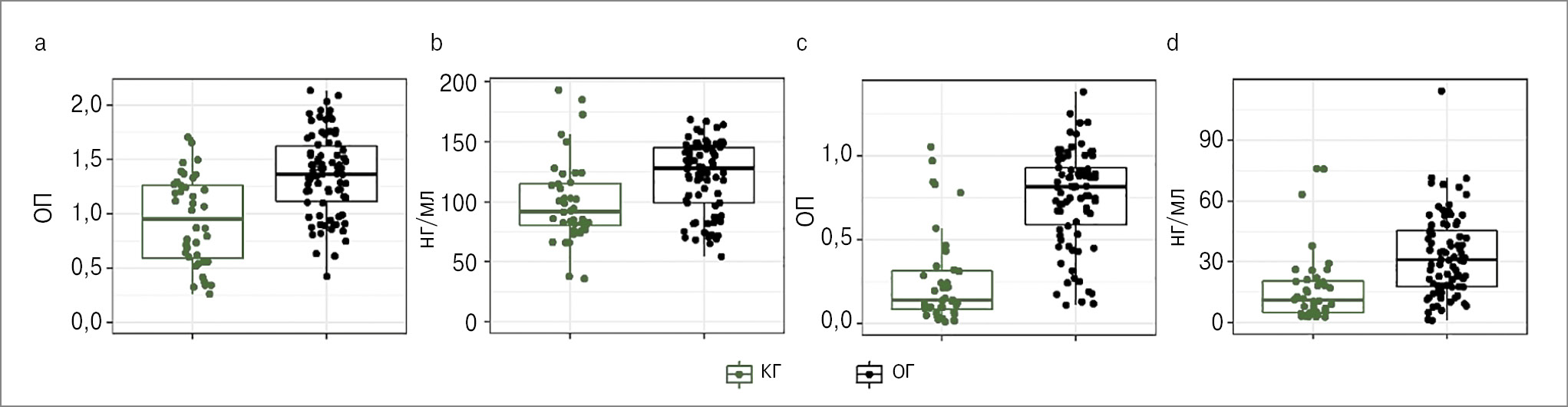 Рис. 2. Количественное определение НВЛ в КГ и в объединенной ОГ: a – комплексы МПО-ДНК в сыворотке; b – дс-ДНК в сыворотке; c – комплексы МПО-ДНК в смывах; d – дс-ДНК в смывах.