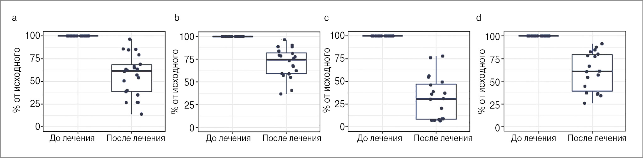 Рис. 3. Динамика количества НВЛ при приеме азоксимера бромида (указаны значения параметров в % от исходного уровня): a – комплексы МПО-ДНК в сыворотке; b – дс-ДНК в сыворотке; c – комплексы МПО-ДНК в смывах; d – дс-ДНК в смывах.