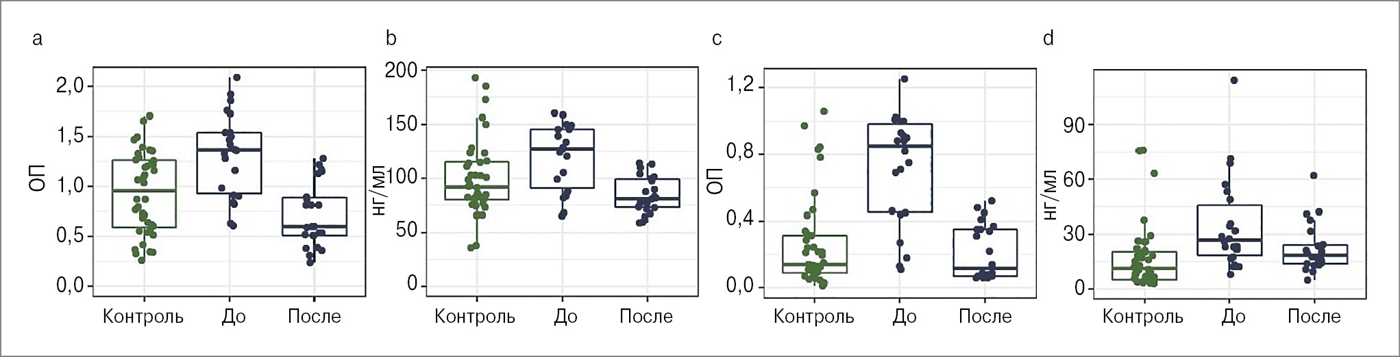 Рис. 1. Количественное определение НВЛ в 3 группах пациентов: a – комплексы МПО-ДНК в сыворотке; b – дс-ДНК в сыворотке; c – комплексы МПО-ДНК в смывах; d – дс-ДНК в смывах.