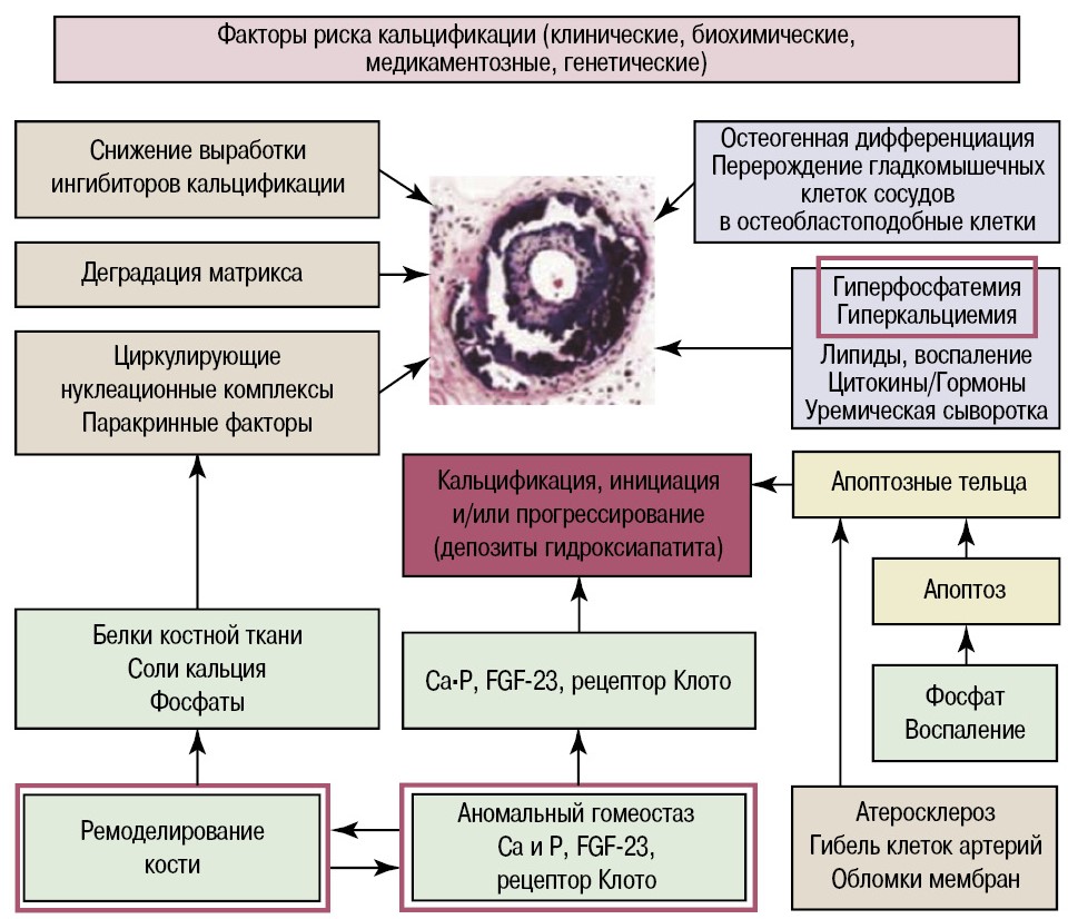 Известно, что повышение уровней фосфора и кальция в сыворотке крови может приводить к активации клеточных и тканевых механизмов кальцификации. Гладкомышечные клетки подвергаются апоптозу, в них определяются ядра минерализации. Развивающийся на фоне ХБП костно-минеральный дисбаланс ускоряет процесс минерализации, что также вторично приводит к быстрому развитию кальцификации коронарных сосудов [6].
