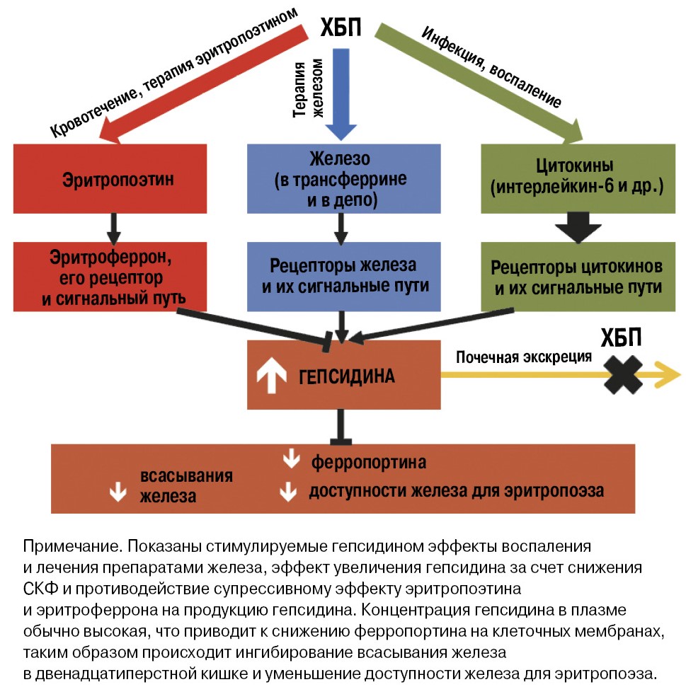 Внедрение эритропоэз-стимулирующих средств (ЭСС) для лечения анемии при почечной недостаточности привело к существенному снижению потребности в переливании крови у пациентов с ТСХБП [7]. Кроме того, анемия является частым и ранним осложнением хронических недиализных заболеваний. Анемия при ХБП возникает не только из-за дефицита эритропоэтина, но также характеризуется дефицитом железа из-за плохой абсорбции железа в кишечнике и низкого уровня ферритина [8–10]. По данным Национального исследования здоровья и питания 1988–2004 гг. (США), ферритин <100 мкг/л, насыщение трансферрина <20% наблюдались у большинства пациентов со сниженной функцией почек [11]. У пациентов с ТСХБП снижение абсорбции железа, вероятно, является следствием чрезмерной продукции регуляторного гормона железа гепсидина. Возможно, это происходит из-за повышенного уровня интерлейкина-6 или других провоспалительных цитокинов, вырабатываемых при ТСХБП [12–14]. Стоит отметить, что гепсидин играет ключевую роль в регуляции метаболизма железа. Гепсидин ингибирует освобождение железа из макрофагов (из старых эритроцитов и ферритина), гепатоцитов и энтероцитов двенадцатиперстной кишки путем связывания с ферропортином. При отсутствии ферропортина выход железа из энтероцитов, гепатоцитов и макрофагов блокирован. Таким образом, гепсидин снижает уровень всасывания железа в кишечнике и уровень освобождаемого железа из гепатоцитов и макрофагов, что приводит к низкому уровню железа в плазме и повышению в тканях (рис. 2) [15, 16].